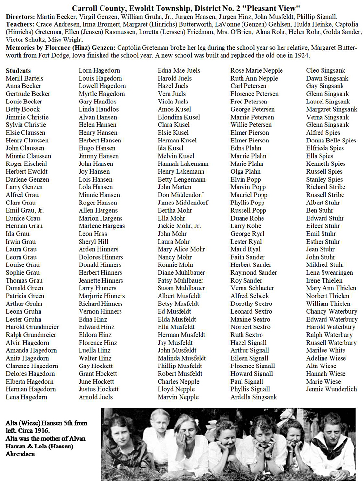 1959 former students: Dennis Backhaus, Darlene Breidert, Gary Brockelsby, Lorraine Christensen, Helen Dethlefsen, Phyllis Fritz, Richard Hinners, Mary Jentsch, Jolene Koch, Larry Martens, James Middendorf, Ronald Mohr, Donna Mundt, Edward Neubaum, Linda Paulsen, Rose Porter, Michael Schoeppner, Lavina Seals, David Sextro, Kay Stangl, Larry Stangl, Gary Tigges, Carmen Weifenbach, Marilee White, Marilyn Wyatt