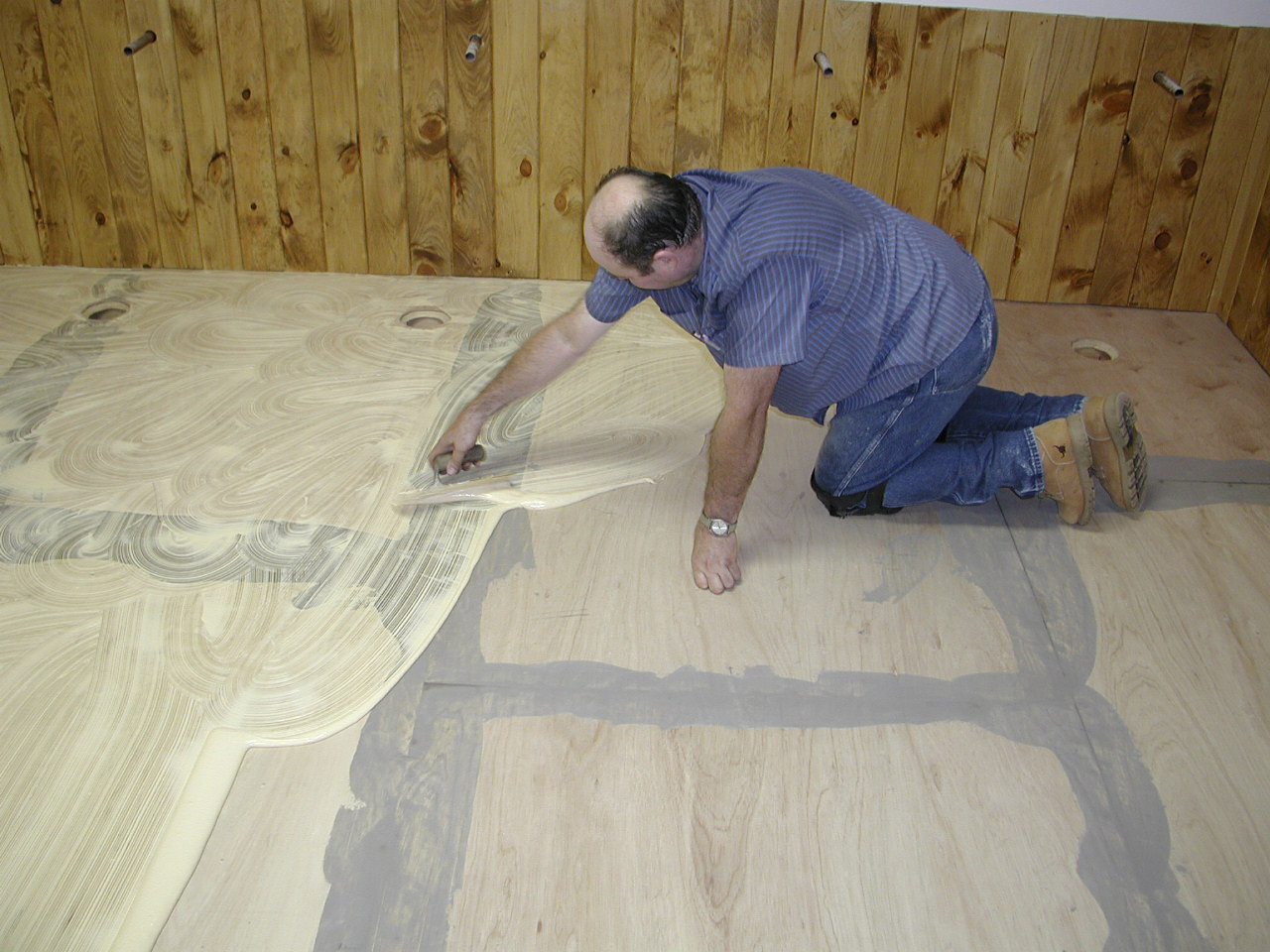 June 20, 2003 applying glue on the floor of the Heritage Park log "Erwin Hansen" conference center