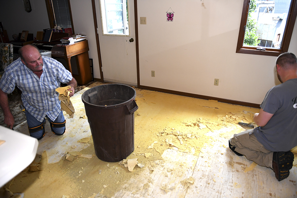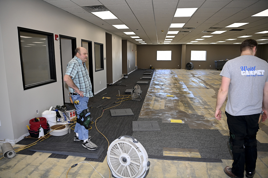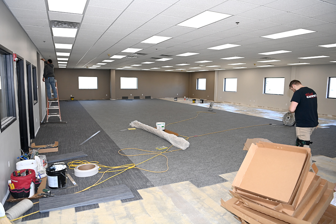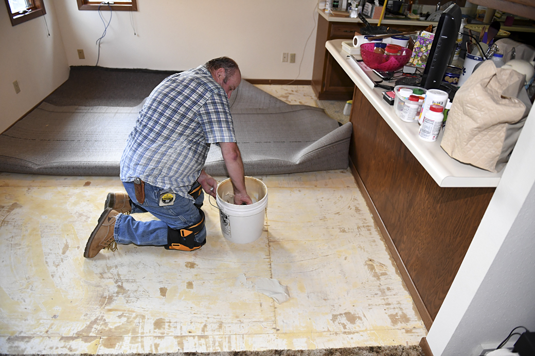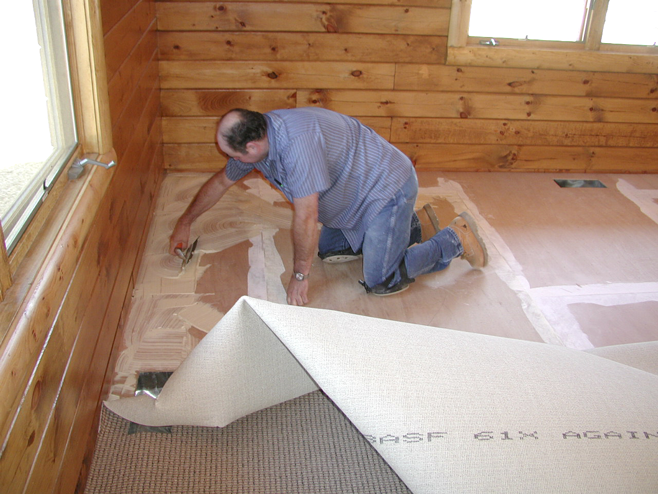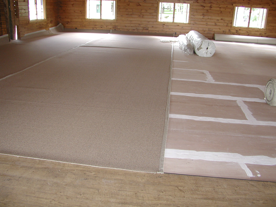 June 20, 2003 laying carpet on the floor of the Heritage Park log "Erwin Hansen" conference center