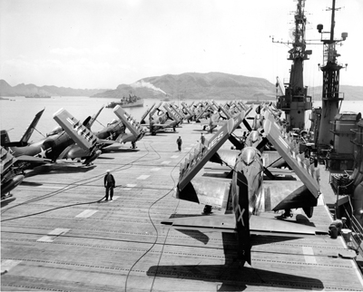 Planes on a air craft carrier in a Japan harbor