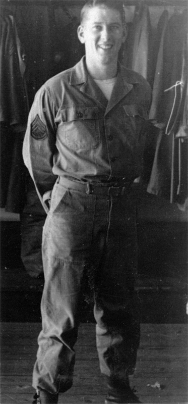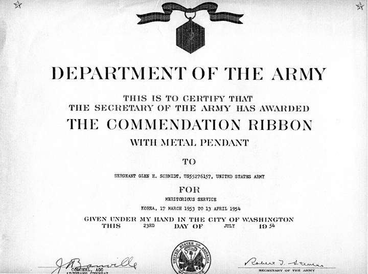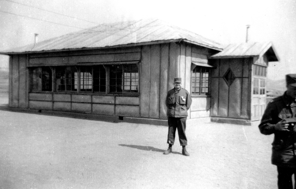 After reaching Korea, he was assigned to the 21st Evacuation Hospital in Pusan, Korea, and worked in the personnel division for enlisted personnel. During that time he was promoted to sergeant and received the Meritorious Service Award with a Metal Pendant. In April 1953, he spent one month on detached duty to Panmunjom, Korea, where sick and wounded prisoners were exchanged with the North Koreans and Chinese. The base camp was located several miles from the site of the exchange; however, he was able to visit the site at one time. While on detached duty, he ran into Bob Joens from Manning who was there as an ambulance driver. He returned to Pusan and spent the remainder of his tour in Korea at the hospital. During his last two months in the Pacific Theater, he was transferred to Yokohama, Japan, where he was on the staff of a rest and recuperation center. The center supplied lodging, food and service to service men and women during their week-long furloughs from Korea. While at that center he met Royce Rowedder, who was serving in the area.