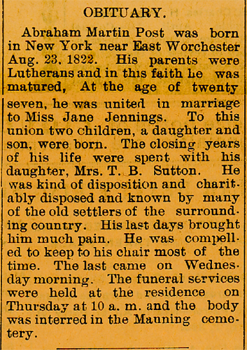 At the age of twenty seven, he was united in marriage to Miss Jane Jennings. To this union two children, a daughter and son, were born. The closing years of his life were spent with his daughter, Mrs. T.B. Sutton.