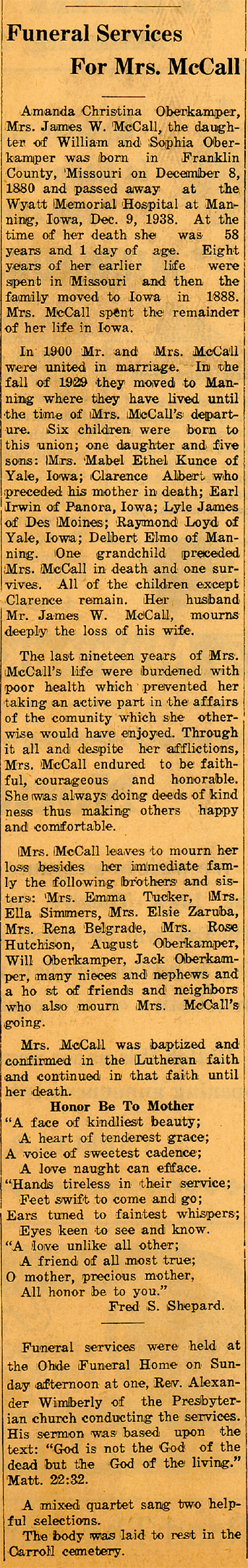 Six children were born to this union; one daughter and five sons: Mrs. Mabel Ethel Kunce of Yale, Iowa; Clarence Albert who preceded his mother in death; Earl Irwin of Panora, Iowa; Lyle James of Des Moines; Raymond Loyd of Yale, Iowa; Delbert Elmo of Manning. One grandchild preceded Mrs. McCall in death and one survives. All of the children except Clarence remain. Her husband Mr. James W. McCall, mourns deeply the loss of his wife.