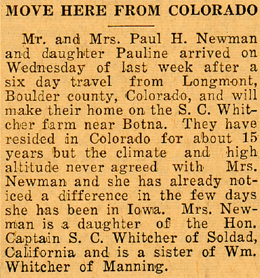 Mrs. Newman is survived by her husband; two daughters, Mrs. Kenneth Ehlers, Manning; and Mrs. Albin Hicks, Los Angeles, California; one sister, Mrs. Harry Clint, Sun Valley, California; two brothers, William Whitcher, Manning, and Reuben Whitcher, Gonzales, California; and four grandchildren.