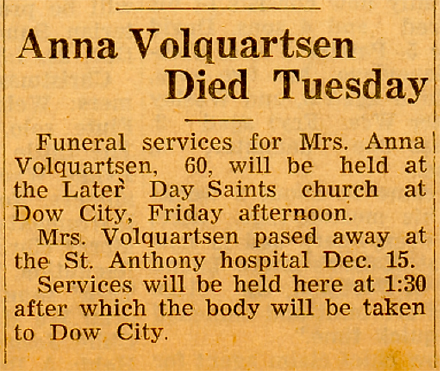 Neighbors of Mrs. Volquartsen in Dow city acted as casket bearers. They were Ward and Lloyd Keairnes, George Ruel, Ward and Claude McDonald, and William Turner.