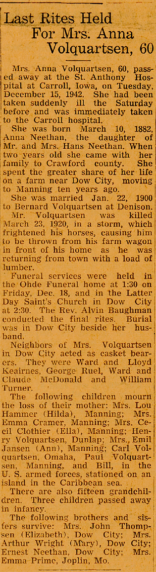 Mrs. Anna (Neethan) Volquartsen of Manning died at 8:30 Tuesday evening at the St. Anthony Hospital in Carroll at the age of fifty-nine years.
