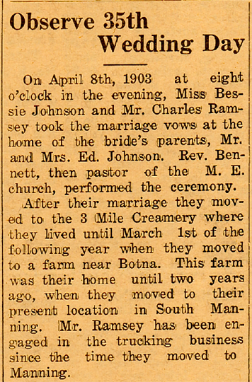 She married Charles H. Ramsey at Manning on April 8, 1903, and they farmed near Manning until moving into town in 1936. She continued to live here following her husband's death on July 28, 1953. Two daughters and a brother also predeceased her.