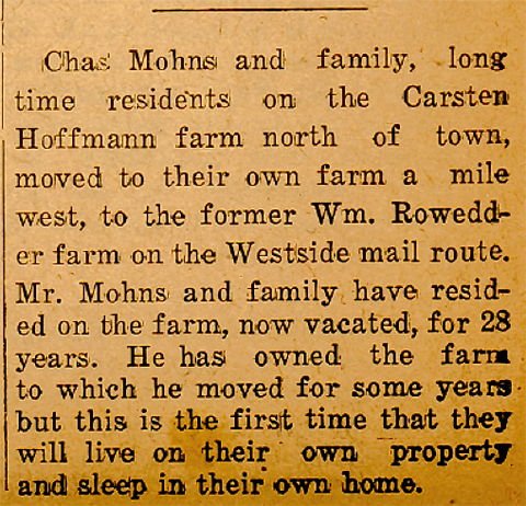 The couple farmed near Manning and Aspinwall, the past 20 years on a farm seven miles northwest of Manning. Mrs. Mohns died in 1931.
