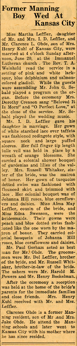 He leaves his wife, Mrs. Martha W. (Leffler) Ohde of the home; three daughters, Mrs. Marthana Johnson, 8618 E. 110th; Mrs. Karen Shaffer, 15206 E. 36th, Independence, and Miss Gayle Ohde, 3541 N.E. 72nd, Gladstone, and seven grandchildren.