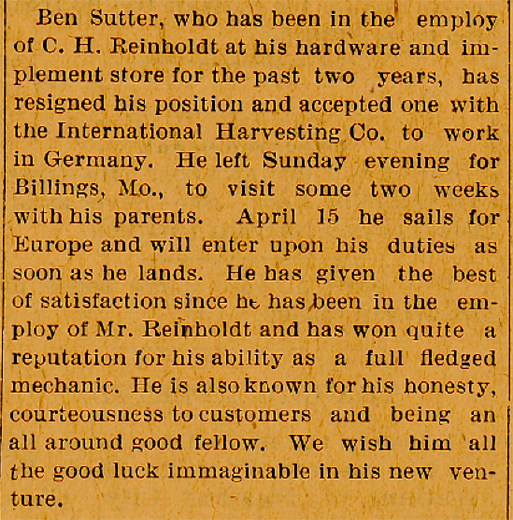Claus Henry Reinholdt was born December 4, 1855, in Wesselburen, Holstein, Germany, where he grew to manhood and received his education. In 1879 he left Germany and came to America to Benton County, Iowa. A year later he came to Westside, where he met Meves Schacht, owner of the five mile house. Later he went to Westside where he accepted a position as clerk for Whiteling & Evers.