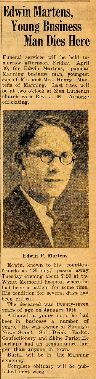 Edwin or "Skinny" at he was known by his countless friends, passed away Tuesday evening, April 27, 1937, at the Wyatt Memorial Hospital in Manning where he had been in a critical condition for several days. About a year previous to his death he had been operated on for sinus trouble in Omaha but had never fully regained his health. Several weeks ago, his condition became worse and he was immediately removed to the Wyatt Hospital. All that medical skill and loving hands could do was extended but all in vain.