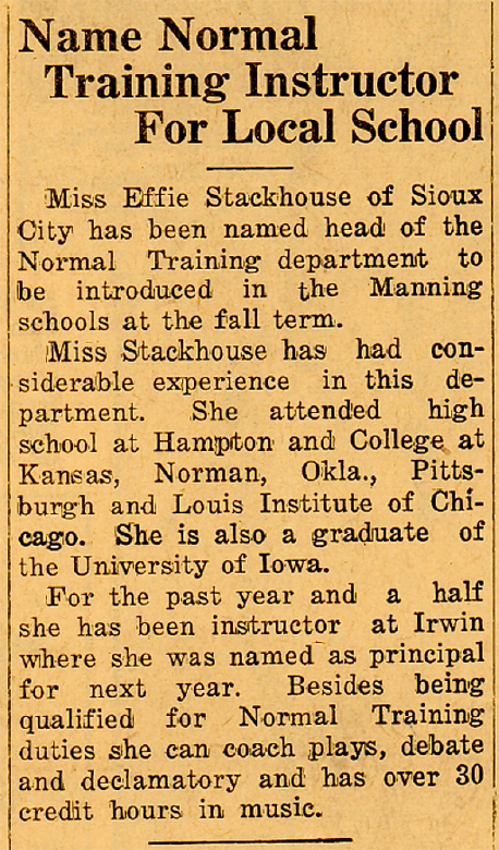 Miss Stackhouse became a follower of her Christ quite early in life and had membership in the Methodist Church, which she kept up to date by transferring it to the community where she lived and worked. Her final transfer in the Church membership was from Manning, Iowa, back to Bedford, in 1945.