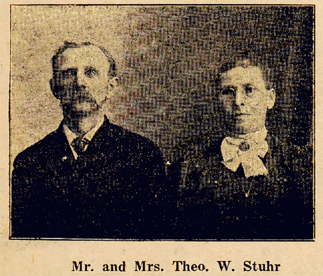 Mr. and Mrs. Theodore Stuhr are pioneer residents of this community. They were looking forward to this summer when they expected to observe their Golden Wedding Anniversary on Thursday, August 5th. Death, however, deprived them of this ceremony.