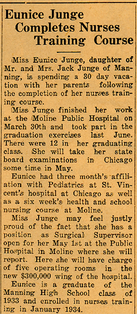 Eunice was born December 28, 1915, in Manning, Iowa, the daughter of John and Laura (Hale) Junge. She graduated from Manning High School in 1933.