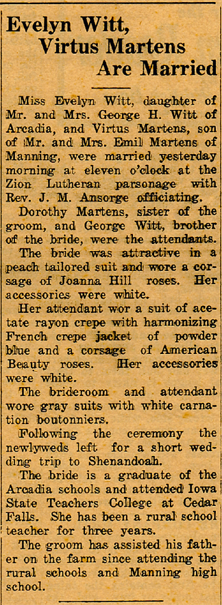 Evelyn Pauline, daughter of George H. and Pauline D. (Jons) Witt, was born June 22, 1915, on a farm four miles north of Arcadia, Carroll County, Iowa. She attended rural school through the eighth grade and then graduated from Arcadia High School in 1932. She completed Normal Training at Iowa State Teachers College in Cedar Falls and taught for three years at Wheatland Township country school.
