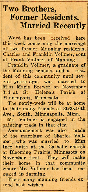 Franklin was born October 27, 1914, in Manning, Iowa, to Frank and Mary (Macke) Vollmer. He married Marie Breuer on November 28, 1937, in Minneapolis. He graduated from Manning High School, Manning, Iowa in 1932. He had resided in Minneapolis, Portland, Oregon, and worked his way up the coast painting ships. He settled in Albert Lea in 1949. Franklin was a member of St. Theodore's Catholic Church, the Eagles, and a social member of the VFW. He was a painter. He also enjoyed watching sports on television.