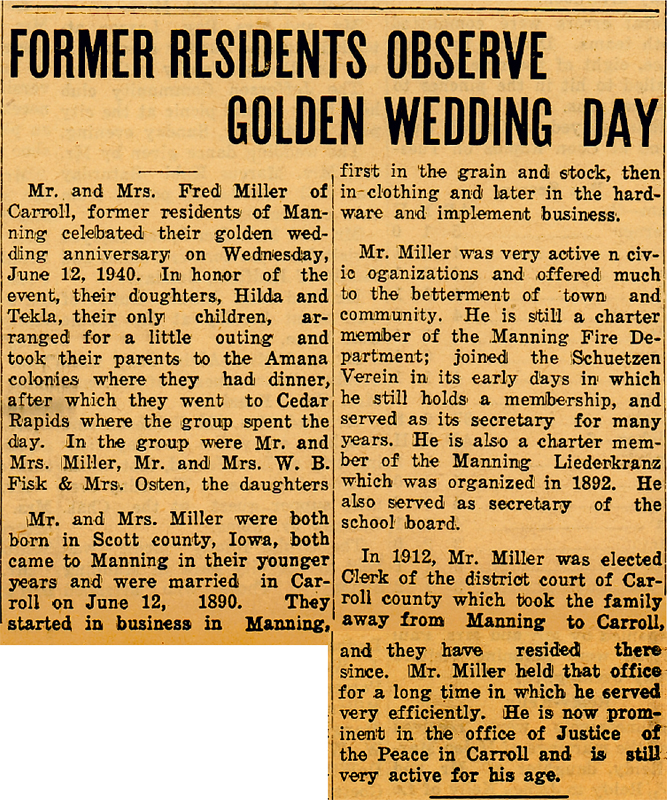 Mr. and Mrs. Miller, who were married in Carroll June 12, 1890, celebrated their golden wedding anniversary in 1940. Mrs. Miller, also a native of Scott County, was Anna Hinrichs before her marriage.