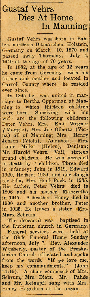 In 1895, he was united in marriage to Bertha Opperman at Manning to which thirteen children were born. Surviving with his wife are the following children: Peter Vehrs, Mrs. Emil Wegner (Maggie), Mrs. Joe Mertz (Verna) all of Manning; Mrs. Henry Jensen (Viola), Audubon; Mrs. Louie Miller (Helen), Denison; Mr. Harold Vehrs, Vail, sixteen grandchildren. He was preceded in death by 7 children. Three died in infancy; John in 1919, Edward 1920, Herbert 1929, and one daughter Ella, Mrs. Emil Puck. in 1935. His father, Peter Vehrs died in 1896 and his mother, Margretha in 1917. A brother, Henry died in 1900 and another brother, Peter in 1925.
