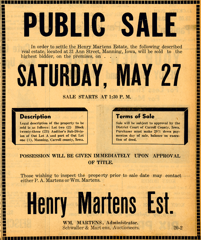 Mr. Martens, who was unmarried, leaves three brothers and one sister: Gus Martens, Carroll; William, Manning; Harry, Buck Grove, and Mrs. Dick Fonken (Emelia), Manning.