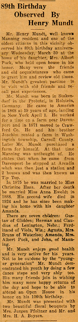 Henry Mundt, one of Manning's oldest residents died at 12:30 Wednesday, January 13th, 1943, at the home of his daughter, Mrs. Albert Puck. He would have been 94 years old on March 30.