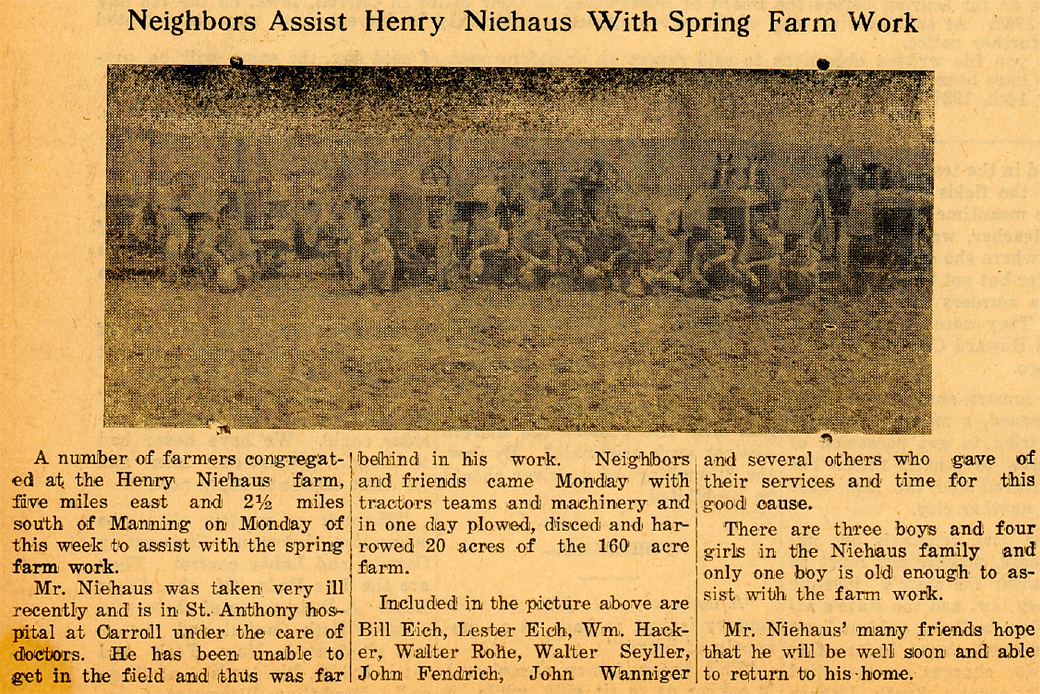 Mr. Niehaus, son of Mr. and Mrs. Bernard and Catharine (Thieman) Niehaus, was born at Arcadia October 28, 1894. He lived at Arcadia until he was married in 1916 to Adeline Stangl at Omaha. The couple lived on farms near Templeton and Arcadia until they moved to Manning.