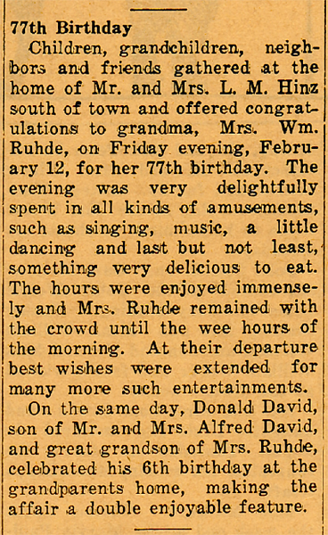 Mr. and Mrs. Ruhde were the parents of eight children of which three survive Bertha, Mrs. Hy. G. Martens and Emma, Mrs. Henry Karsten of Manning; Johanna, Mrs. L.M. Hinz of Audubon. She also leaves 18 grandchildren and 11 great grandchildren, two sisters, Mrs. Emma Schultz of Davenport, Iowa, and Mrs. Mary Langheim, Sioux City, Iowa and many other relatives and friends.