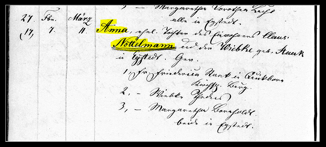 Here is Anna Nottelmann's batismal record February 1852 from a distant Musfeldt relative in Germany, which would be the original and correct spelling before immigrating to