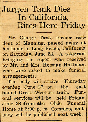Funeral services for Jurgen Tank, 88, who passed away at his home, in Long Beach, California, June 22, were held in the Ohde Funeral Home at Manning Friday at 2 o'clock. Rev. Alexander Wimberly conducted the services, Clifford M. Johnson, accompanied by Mrs. Bonita Hagedorn, sang. Pallbearers were P.H. Jones, R.G. Sutherland, H.C. Reinholdt, Ed Breckenridge, August Reinhold and Harry Schacht.