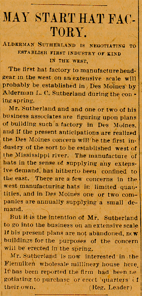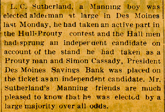 Mr. Sutherland was widely known in this territory through his connection with the creamery business. He left Sioux Falls soon after disposing of his interests in the Diamond Creamery on January 1, 1926, going to Storm Lake, Iowa, where he was also engaged in the creamery business. Recently he went to Jewel to take charge of a closed bank for the Iowa banking department.