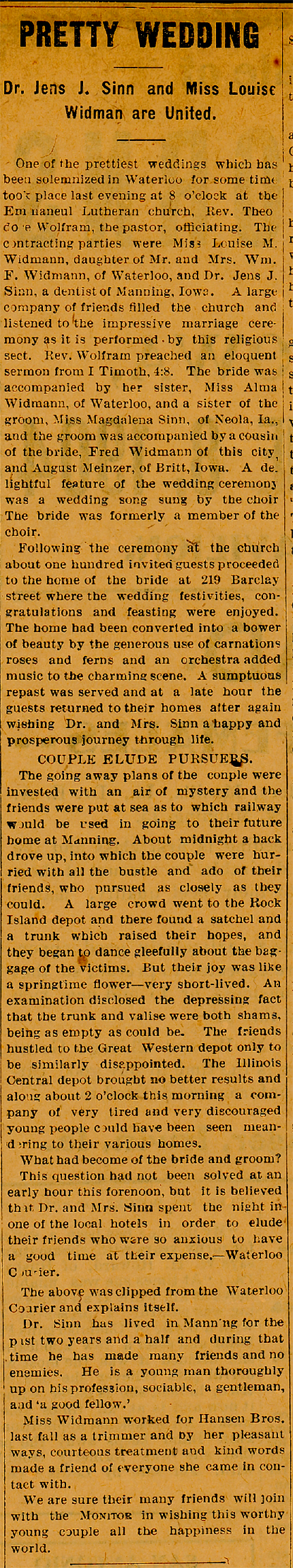 She came to Manning as a milliner in 1902. In 1904, she married Dr. Jens J. Sinn, a dentist, and they made their home here. Dr. Sinn died in 1955. Mrs. Sinn continued to live in her own home until 2 1/2 years ago, when she went to Davenport and spent a year with a daughter.