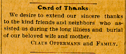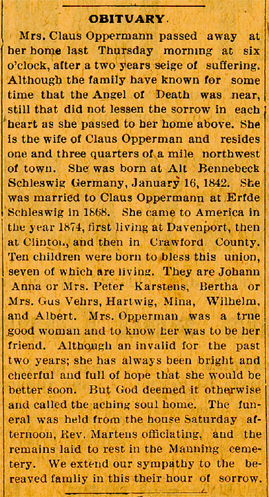 Mrs. Claus Opperman passed away at her home last Thursday morning at six o'clock, after a two year siege of suffering. Although the family have known for some time that the Angel of Death was near, still that did not lessen the sorrow in each heart as she passed to her home above. She is the wife of Claus Opperman and resides one and three quarters of a mile northwest of town. She was born at Alt Bennebeck, Schleswig, Germany, January 16, 1842. She was married to Claus Opperman at Erfdt Schleswig in 1866. She came to America in the year 1874, first living at Davenport, then at Clinton and then in Crawford County. Ten children were born to bless this union, seven of which are living. They are Johann , Anna or Mrs. Peter Karstens, Bertha or Mrs. Gus Vehrs, Hartwig, Minnesota, Wilhelm and Albert.