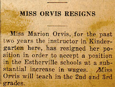 SHE STARTED HER schooling in Jackson School and her first grade teacher there, Vera Brown, was Miss Orvis' principal when she came back to Estherville to teach. She also went to junior and senior high in what is now the Middle School.