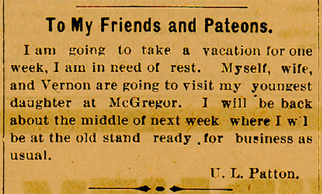 U.L. Patton, who has resided in Manning for the past twenty-six years, passed away at his home in this city last Sunday afternoon. The cause of his death being heart trouble and dropsy.
