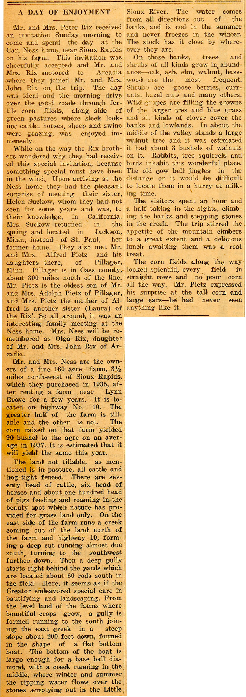 County, Iowa, until 1900 when they moved to Cass County, near Pillager and farmed in May Township.