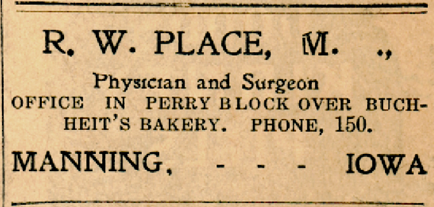 Dr. Place practiced over fifty years in Iowa and South Dakota, retiring in 1934, when he moved to Council Bluffs. He was graduated from the Drake University Medical School in 1884 and practiced in Buchanan and Calhoun Counties in Iowa.