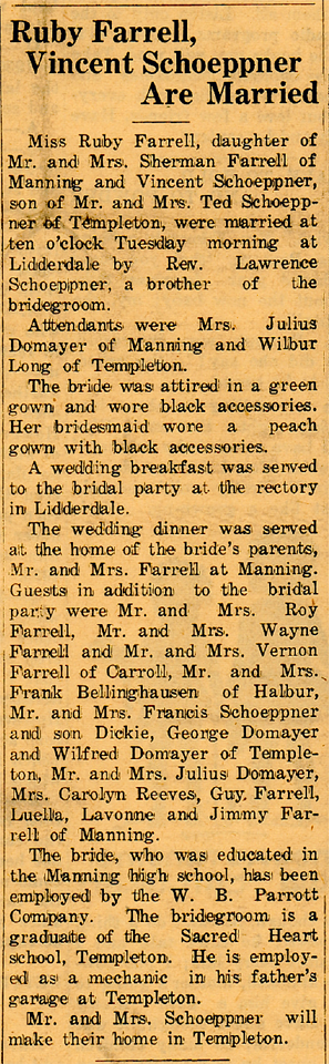 Mrs. Schoeppner is survived by four sons: Bobbie, Ronnie, Jerry and Danny, all of Stewartville; seven grandchildren and a great-grandchild; a sister, Luella (Mrs. Earl) Meiers, Carroll and three brothers: Roy Farrell, Carroll; Jim Farrell, California; and Guy Farrell, Arkansas.