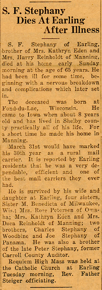He is survived by his wife and daughter at Earling, four sisters, Benedicta Finken of Milwaukee, Wisconsin; Mrs. Rose Petersen of Omaha; Mrs. Kathryn Eden and Mrs. Dora Reinholdt of Manning; two brothers, Charles Stephany of Woodbine and Joe Stephany of Panama.
