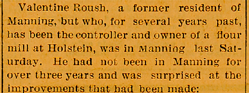 Mr. Roush conducted mills at Anita, Fontanelle, Atlantic, Manning (1880-88 built the Manning Roller Mill in 1882), Holstein, and Onawa, in the order named, spending the longest time in Holstein. Here Mr. Roush was one of the leading, active businessmen, and here he formed friendships that lasted throughout life. His visits here were quite frequent, and often he was heard to say that it was just like coming home. After his retirement front business at Onawa he moved to Sioux City. His wife preceded him in death two years ago.
