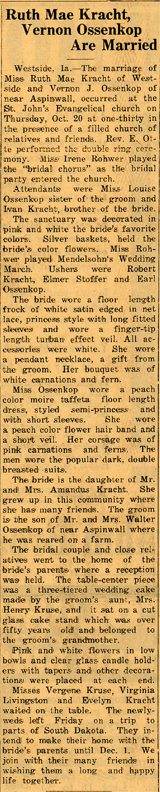 Mr. Ossenkop was born January 27, 1912, near Aspinwall. He was raised on a family farm in Hayes Township and received his education in rural schools. He married Ruth Kracht October 20, 1938, in Westside. He was a lifelong Vail area farmer, retiring in 1977 because of poor health.