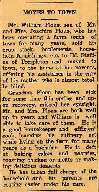 Born September 7, 1887, in Iowa Township of Crawford County, he farmed until 1940 when he moved to Manning to live with his parents, Joachim and Dorothea (Wiese) Ploen. His mother died in 1946 and his father in 1948, after which time he lived alone in Manning. In February of 1965 he went to a nursing home in Coon Rapids, before moving later that year to Sac City.