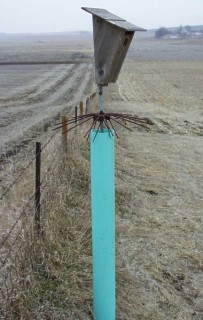 | Last year the raccoon found the birdhouses and raided the Tree Swallow nests. Fortunately most of the baby Swallows had left the nests. | This year I am trying this circle of ¼ inch rods to see if the coon can climb around it. |