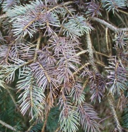 To the left is a Spruce tree infected with Rhizosphaera. This fungus usually preceeds Cytospora Canker by weakening the tree and making it an easy target for the deadly Canker. Needles become infected one year and the next year they turn a purplish-brown. First spray should be applied when new needles are half grown and again when fully grown. Rhizosphaera is easily controlled in 2 seasons unless the tree has become heavily infected. |