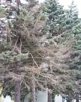 This 30 year old spruce tree started showing signs of Cytospora Canker this year. There are areas of dead branches throughout the tree. |