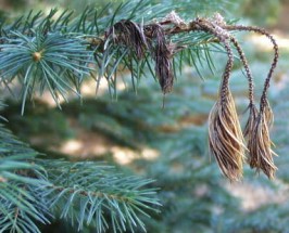 Above is Sirococcus Shoot Blight. You will see new needles die and fall off and other shoots will curl and become hooked shaped. This fungus can kill seedlings but generally won't cause severe damage to older trees. |
