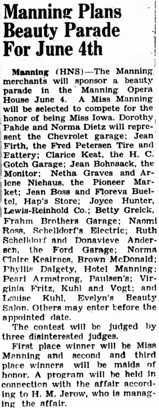 Manning Opera House Tuesday, June 4, 1940. From 60 girls entered in the