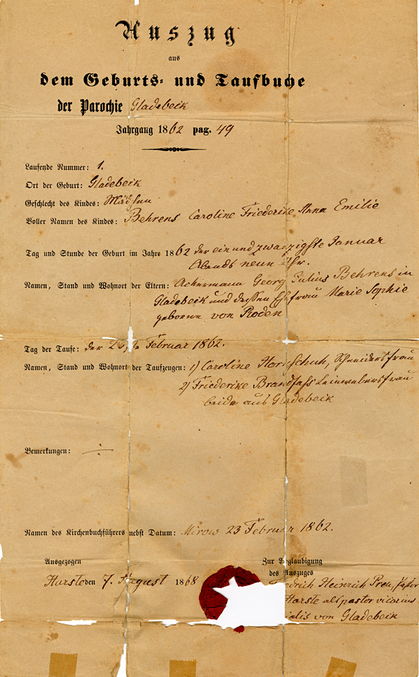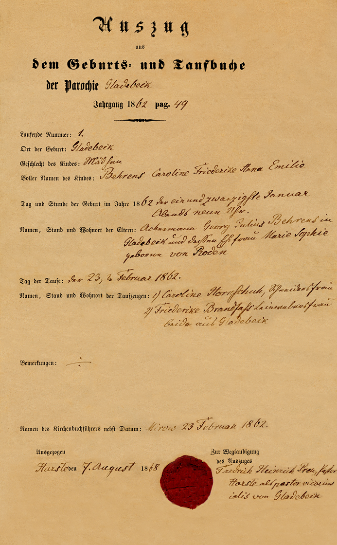 Emilie Behrens baptism document