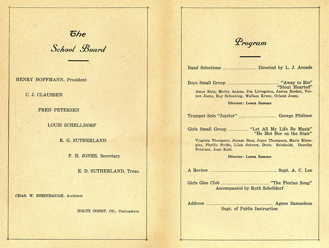 1938 former students: Mary Algren, Luella Anton, Helen Asmus, Darrell Bailey, John Allen Bailey, Gordon Barnes, Jimmie Crider, Lyle Dudgen, Kenneth Esser, Ione Fister, Mary Freese, Elroy Graninger, Craig Grover, Dewey Hargens, Harry Hargens, Jacquetta Hockett, Carl Jones, Jonnie Jones, Bernice Karsten, Bernard Kuhse, Neal Markley, Vernet McMahon, Melvin Mitchell, Vernie Mock, Martha Murphy, Louis Plotz, Clifford Precht, Orren Ramsey, Velma Ranniger, Margaret Rasmussen, Bernice Schumann, Edna Sextro, Ila Sievers, Betty Jean Torgerson, Phyllis Ulman, Bobby Wailes, Dorothy Wheeler, Marcella Wiese, Virgil Wiley, Reva Wrigley, Ralph Zender