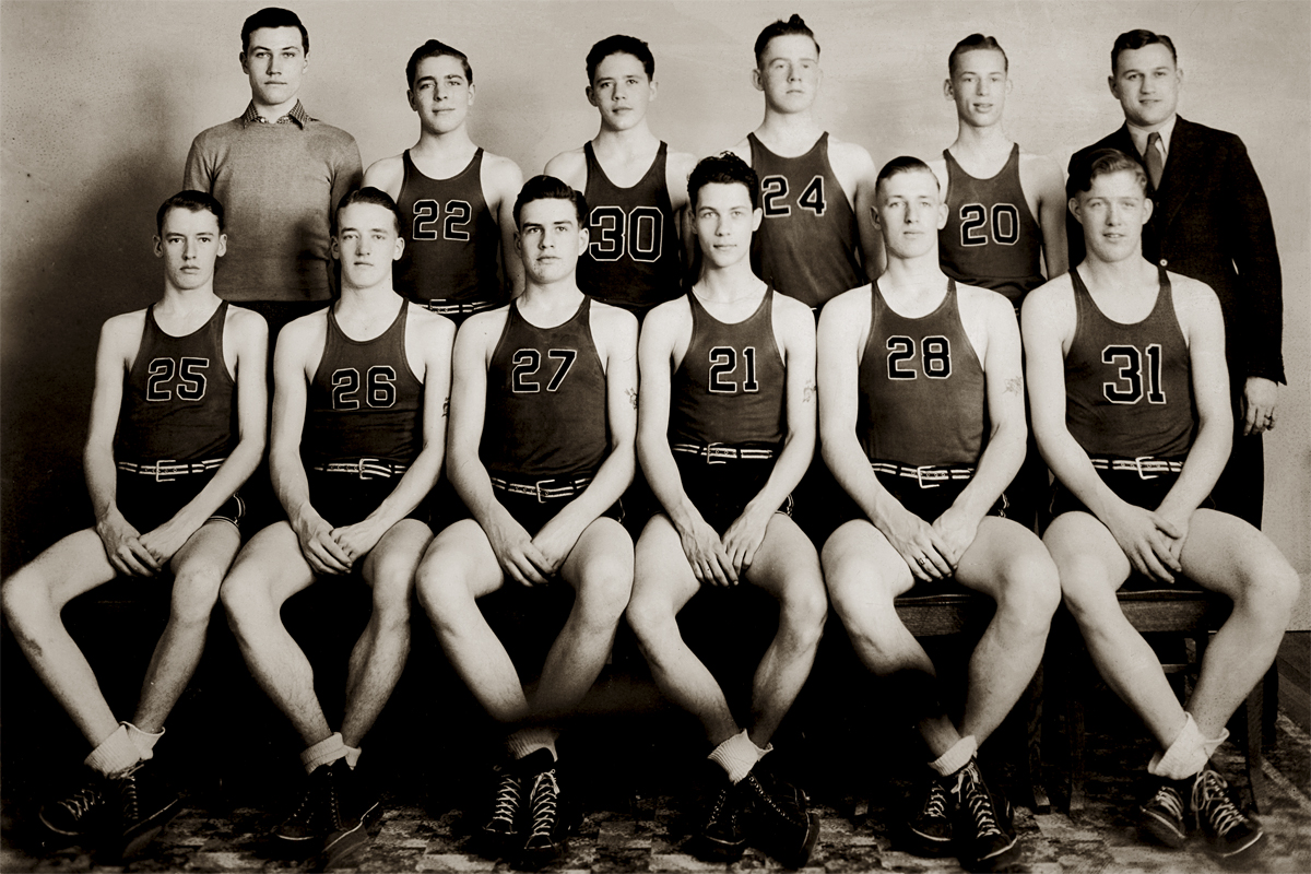 1937-38 Back: Wayne Schelldorf, Gene Claussen, Francis Zerwas, Lyle Arp, Wayne Schrum, Coach Joe Rogers