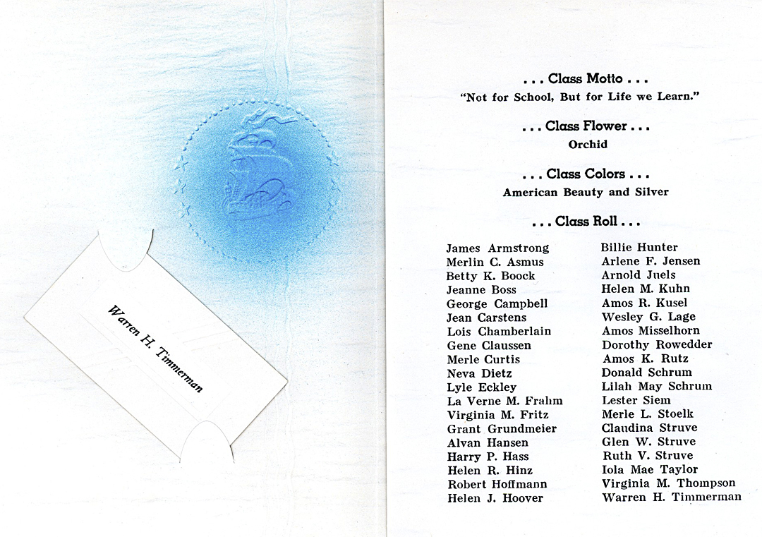 These are some of the children of members of this class who are living in/around Manning: Glen Struve (Kevin), Amos Rutz (Karl), Robert Hoffmann (Dean), George Campbell (Harry), Iola (Taylor) Stammer (Calvin), Amos Misselhorn (Keith), Amos Kusel (David), Wesley Lage (Brian, a nephew), Helen (Hinz) Wegner (Connie Wegner Singsank), Helen (Kuhn) Weible (Tim Weible), Orren Ramsey (Kay Ramsey Rutherford)
