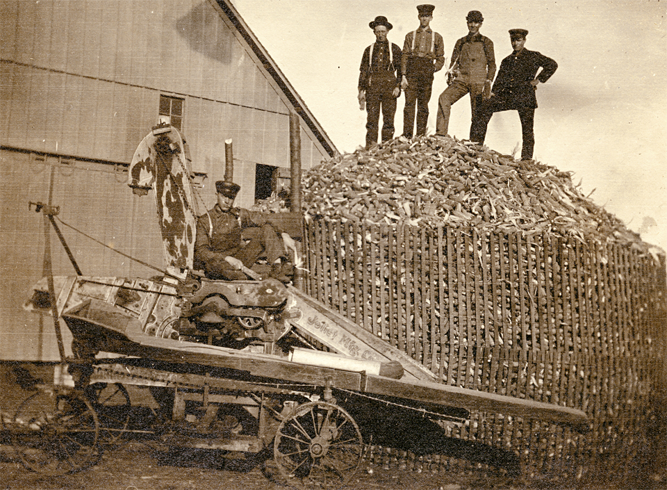 On top of the corn pile are Chris Ehrichs, Louie Ehrichs, August Ehrichs, and Carl Otto